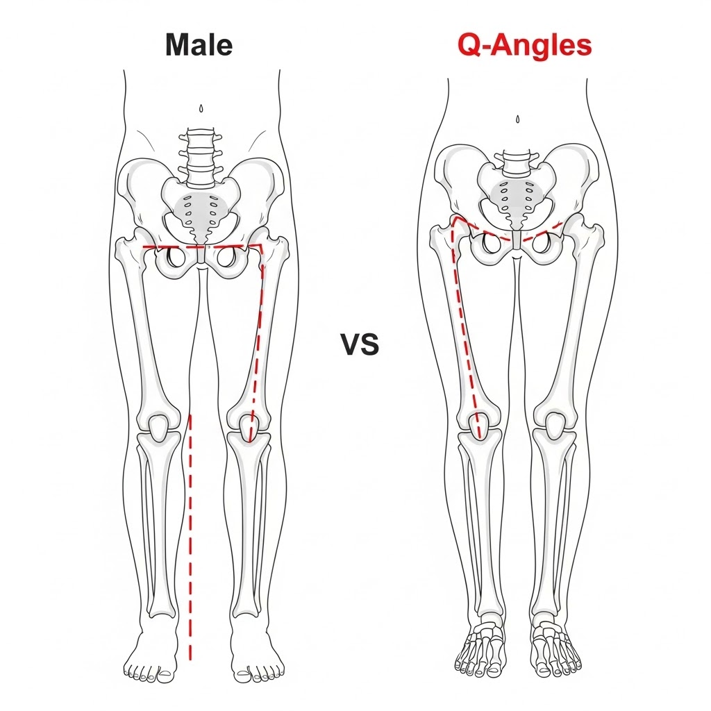 여성은 남성보다 골반이 넓습니다. 따라서 허벅지 뼈에서 무릎으로 내려오는 각도인 ‘Q-Angle’이 남성보다 더 큽니다.