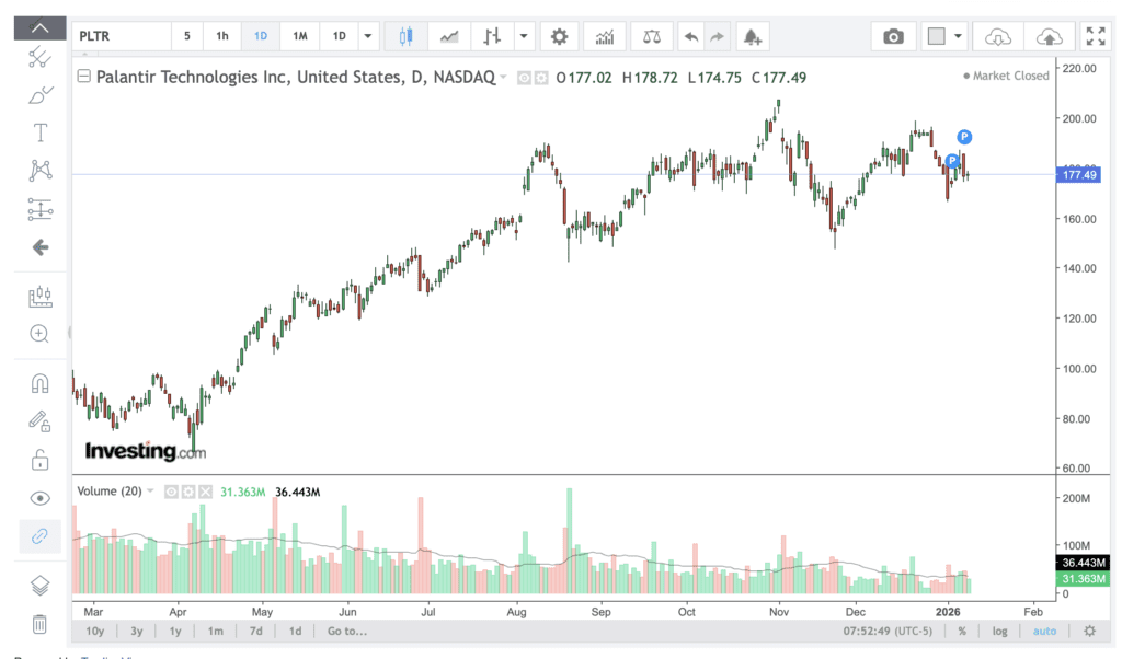 최근 팔란티어 주식이 12월 중순 $198까지 상승한 후 최근 약 $166 까지 하락하며 연 고점인 $207을 뚫지 못하고 있습니다.