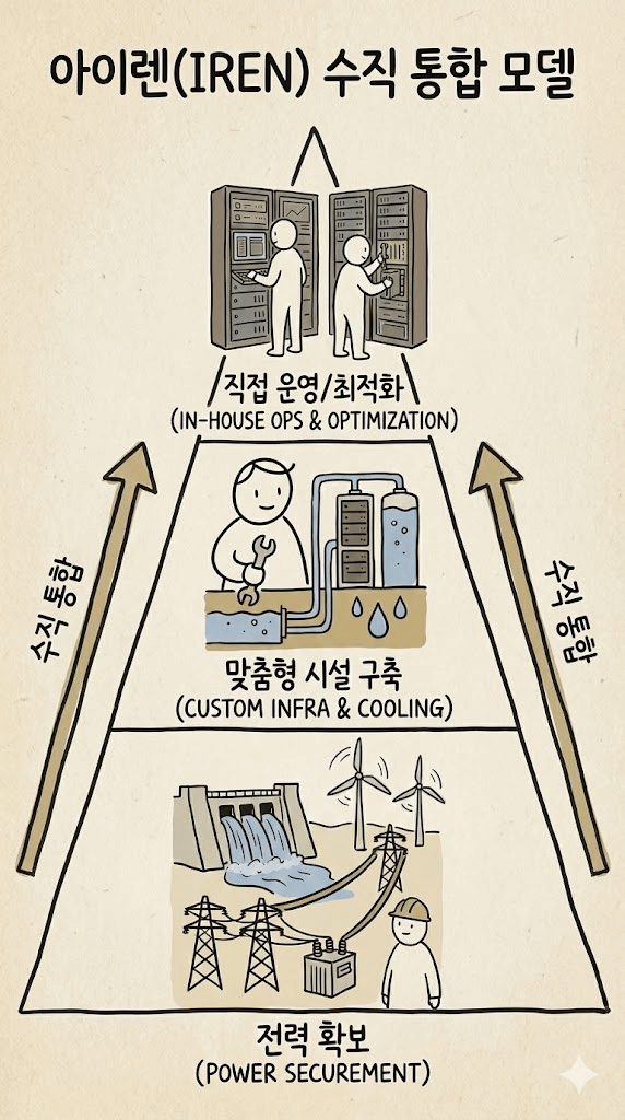 아이렌의 수직 통합 운영은 1) 전력 인프라 보유 2) 데이터 센터 시설 보유를 바탕으로 운영 됩니다.