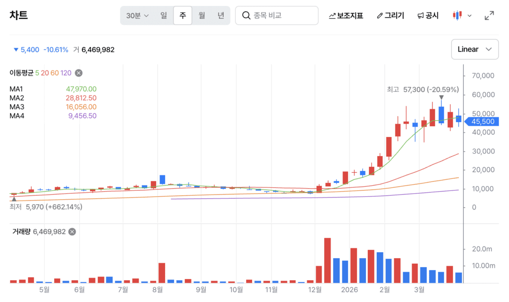 2026년 초 14,000원대였던 주가는 45,000~ 50,000선으로 지지선을 형성 했습니다.